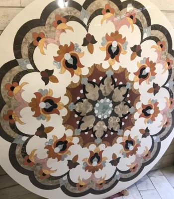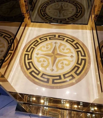 معرق کف لابی با طرحهای خیرهکننده خورشیدی، اسلیمی، کلاسیک و مدرن؛ اجرای بینقص با سنگهای وارداتی و ایرانی برای لابی برجهای لوکس تهران، کیش و مشهد.